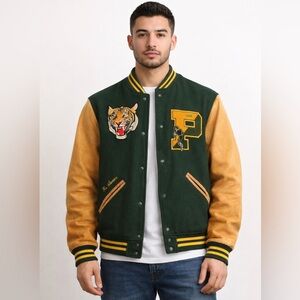 This Polo Ralph Lauren varsity letterman jacket is a rare collector’s piece, crafted with genuine tan leather sleeves and a deep green wool body accented in yellow. Featuring bold embroidered details and a striking tiger patch, this XXL jacket delivers both luxury craftsmanship and vintage-inspired streetwear style. Lightly worn only twice and in excellent condition, nearly indistinguishable from new. No garment bag included.