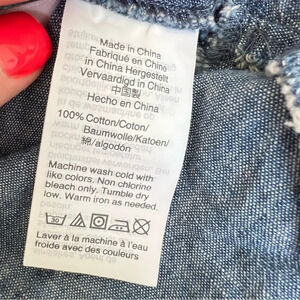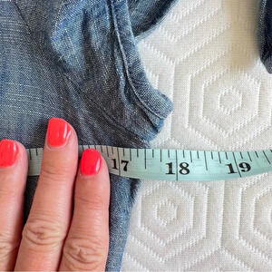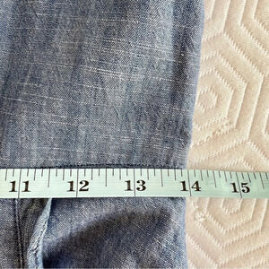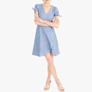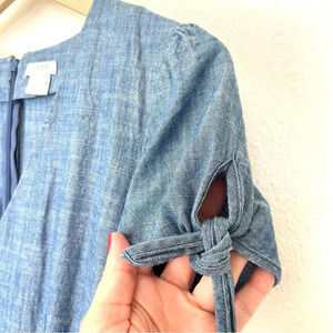 J. Crew Chambray Ruffled Wrap Dress with ties on the short sleeves, zipper closure on the back and a V-neckline. Lightweight & breathable, perfect for Spring, Summer, and transition to fall.