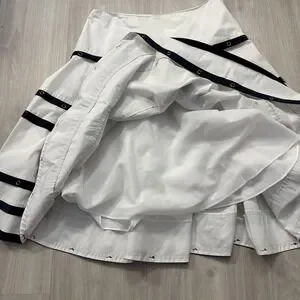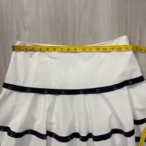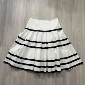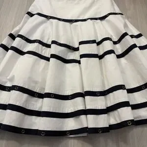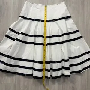 Keywords: Cache skirt, women's skirt, size 10, white skirt, navy stripe, A-line, midi skirt, summer fashion, resort wear, classic style, grommet detail, designer skirt