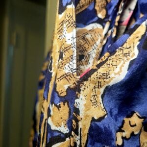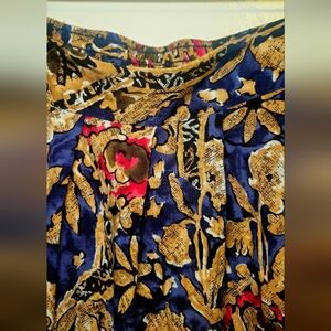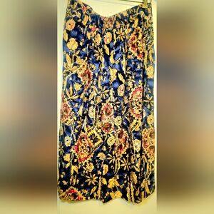 This elegant skirt features a vibrant floral pattern in blue, gold, and red. Perfect for adding a touch of sophistication to any outfit.