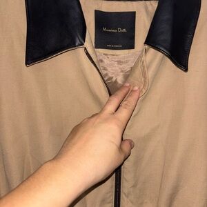 Stylish Massimo Dutti trench coat. Features a tan body with a sleek black collar. Perfect for versatile wear.