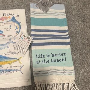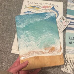 Set of two beach-themed kitchen towels. Features ocean and fish designs. Perfect for coastal decor. With a small ocean epoxy cutting board new and never used