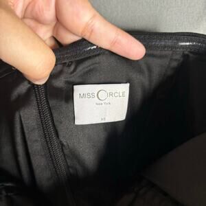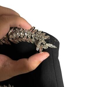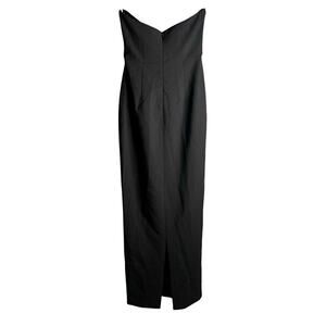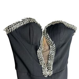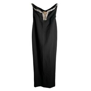 Miss Circle Ivanna Crystal Embellished Maxi Dress in Black. Size XS / Extra Small. Features strapless, plunge V-neckline, crystal embellished trim, boned corset, back slit, hidden back zipper closure, and maxi length. Style 2521MC37XXS. Crystal embellishment starts to loosen on one end as shown in last photo.