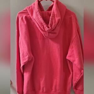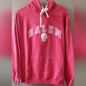 Cozy pink hoodie with 'Salem' print and flying witch. Features a front pocket and drawstring hood. Pre used condition.