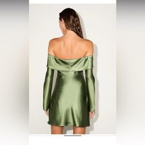 Chic satin dress with long sleeves. Off-shoulder design. Perfect for elegant outings. NWT, tag has been cut.