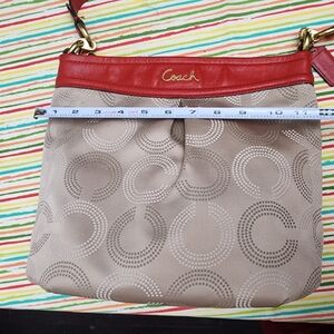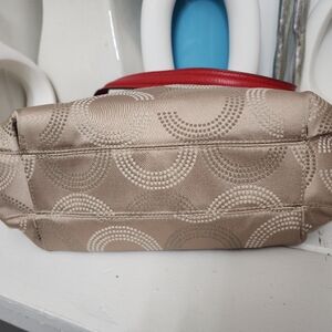 This is a beautiful fabric with red leather trim Coach hobo/Tote bag l. It is in excellent pre-owned condition and is ready for use. Roomy interior with an interior zippered pocket and an zippered pouch on the back side. Beautiful light tan interior is spotless. Gorgeous bag!