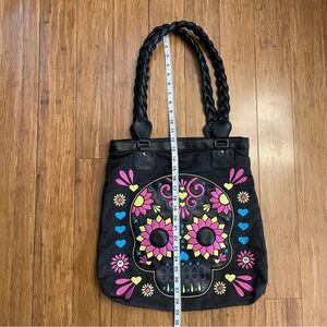 Loungefly Dia De Los Muertos Sugar Skull Motif Double Braided Straps Tote. This Tote is in perfect NWOT condition and has vibrant embroidered details with bold florals and bright hues. Features a zippered pocket and a cell phone pocket. Made from simulated leather black denim-like fabric for the tote. Measurements are: 16 X 15 inches Braided handle is approximately 26 inches ✨ From a smoke-free home 📦 Important Shipping Update Due to the ongoing Canada Post labour action, I will be shipping exclusively with Purolator to ensure reliable and timely delivery. Purolator does not deliver to PO Boxes, so please update your mailing address to a civic (street) address before purchasing. This helps avoid delays and ensures your order arrives without issue. Thank you for your understanding! 💸 New to Poshmark? Use my code POSHROCKS_HD at sign-up to get $15 Posh Credit!