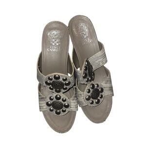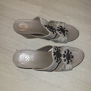 Keywords: Vince Camuto, wedge sandals, embellished sandals, metallic sandals, snake print, strappy sandals, women's wedges, fashion sandals, summer shoes, designer sandals, statement sandals