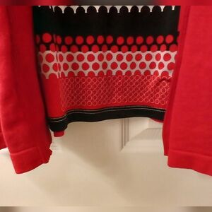 This Alfred Dunner faux‑layered top gives you the look of a coordinated cardigan and tank in one easy, comfortable piece. The outer layer is a solid red lightweight sweater knit with long sleeves and an open‑front design. Underneath, the attached “tank” features a multicolor geometric print in red, black, and white for a bold, eye‑catching contrast.