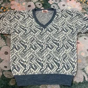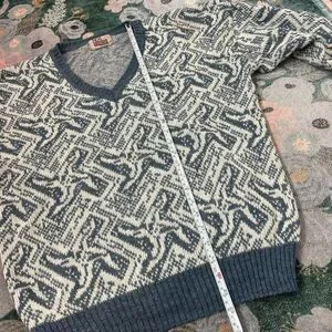 First Landing Sweater Mens Large Blue Abstract Wool V Neck Pullover Cardigan retro relaxed geometric design pattern