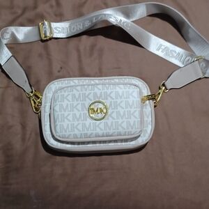Stylish IMJk logo crossbody bag. Features gold accents and adjustable strap. Perfect for everyday use.
