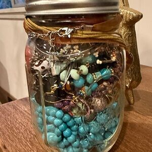 The glass jar itself is charming and reusable, making this a great gift or personal jewelry treasure. Pieces appear to be in wearable condition with natural variation expected in a true mystery lot. Some items may be signed or designer, while others are fun fashion finds—part of the excitement is discovering what’s inside.