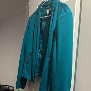 Elegant teal blazer featuring stylish zipper pockets. Ideal for versatile wear.