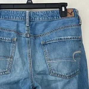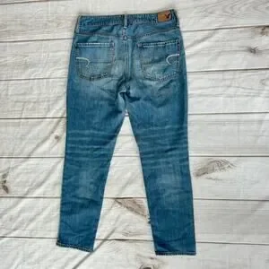 Women's American Eagle Tomgirl denim blue jeans with a straight leg fit. These jeans feature a distressed design with patches, offering a bohemian, boho, and hipster aesthetic suitable for a grunge or skater style.