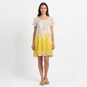 HD in Paris Dipped Chroma Swing Dress from Anthropologie with pastel floral pattern underdress, and ombré yellow/cream sheer over dress. Excellent pre owned condition. Size 6