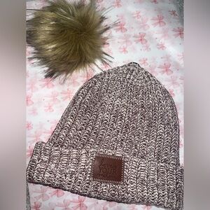 Stylish knit hat with a fluffy pom. Perfect for keeping warm. Removal Pom Pom on top as pictured. Minor discoloration from make up interiorly.