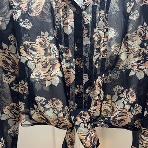 Chic black blouse with floral design. Beautiful Sheer fabric and tie-front detail. Perfect for stylish outings.