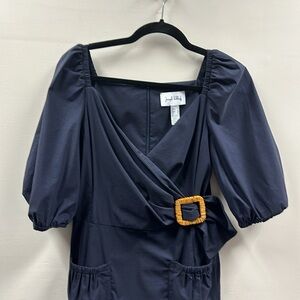 Joseph Ribkoff Faux Wrap Navy Dress Puff Sleeve Rattan Buckle Sz 6 Professional
