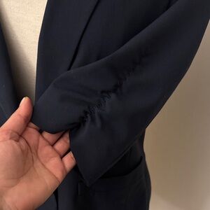 Stylish navy blazer featuring ruched sleeves. Perfect for a chic look.