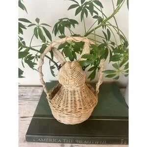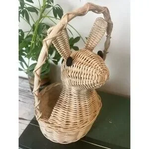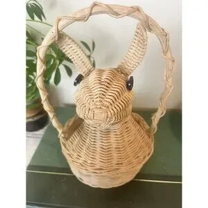 Vintage 1980s Bunny Rabbit Shaped Wicker Basket Easter Handle Spring Home Decor