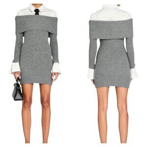 New with tags. The Ser.O.Ya Elodie Sweater Dress is a chic, structured knit mini dress crafted in a heathered gray ribbed fabric. Designed with an off-the-shoulder neckline layered over a crisp white shirt collar and dramatic flared cuffs, this dress delivers an elevated, preppy aesthetic. It features long sleeves, a tailored silhouette, and is unlined with a close bodycon fit. Tie not included.