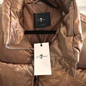Brand new with tags 7 For All Mankind cropped puffer jacket in a luxe bronze metallic satin finish. Designed with a waist-length cropped silhouette, stand collar, and full zip front for modern, effortless layering. Features quilted puffer construction, insulated fill, side pockets, and ribbed cuffs and hem for warmth and structure. Slightly oversized fit for an on-trend look.