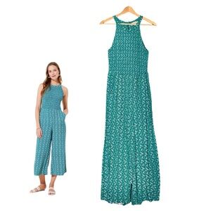 Loft Floral Smocked Crisscross Back Jumpsuit Green White Floral Print Size 6