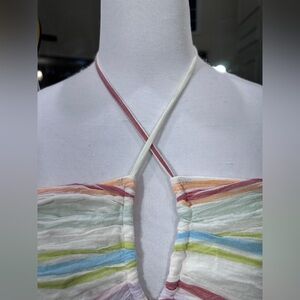 Effortlessly soft and lightweight, this American Eagle maxi dress is made for summer and warm-weather styling. Featuring a multicolor vertical stripe print, crinkled cotton shell, and full lining for comfort. The halter neckline includes a keyhole front and stretch panel in the back for added ease. Side seam pockets make this both stylish and functional. Finished with a flowy tiered skirt for movement and breathability.