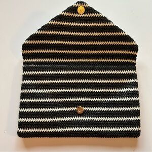 Chic Black and White Striped Straw Clutch with Gold Chain Shoulder Strap