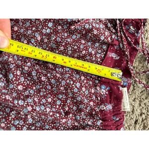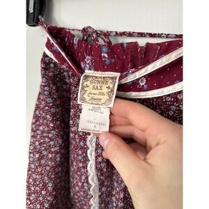 Gunne Sax Jessica Limited prairie midi skirt in a rich burgundy floral print. This skirt features delicate white lace trim and ruffles accentuating its tiered design, offering a charming vintage aesthetic. A drawstring waist ensures a comfortable and adjustable fit.