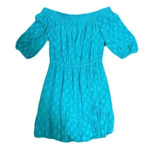 Beautiful Lilly Pulitzer dress in a rich teal green with an allover textured clip-dot fabric for subtle dimension. Features a smocked elastic neckline, soft blouson sleeves, and a defined elastic waist for an easy, flattering fit.