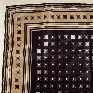 Retro YSL Silk Scarf Vintage Circa 1980s EUC in camel/tan, chocolate brown, edged in white, tan, brown striped perimeter.