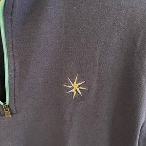 Men’s. Peter Millar. Blue 1/4 zip sweater sweatshirt. Pullover jacket. Warm. Pockets. Light blue zipper. Embroidered star logo on the chest. Preowned condition. No stains/tears. Size Medium.