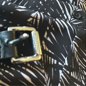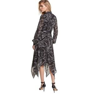 Elevate your style with this light and airy MICHAEL Michael Kors long-sleeved midi shirtdress. Featuring a chic black-and-white fawn leaf print, button closures down the front, and a flattering belted waist, this dress offers a sophisticated, fitted silhouette. The handkerchief hemline adds an asymmetrical, fluttering movement, making it perfect for the office or a special event.