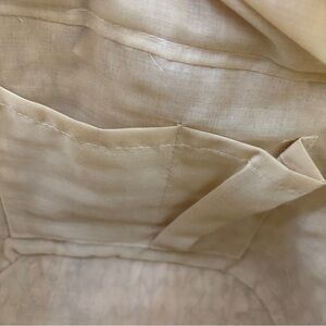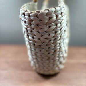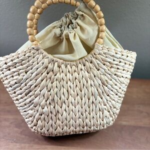 Straw Triangular Tote with Circle Bead Handle, Cinch Closure, EUC