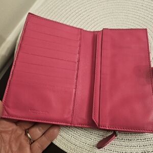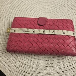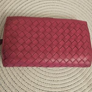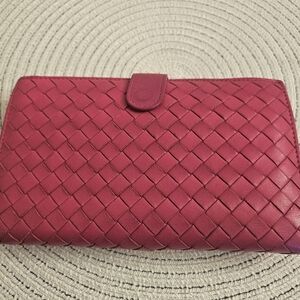 Timeless Bottega Veneta long wallet crafted in iconic Intrecciato woven leather in a beautiful pink/rose shade. Elegant, functional, and effortlessly chic.