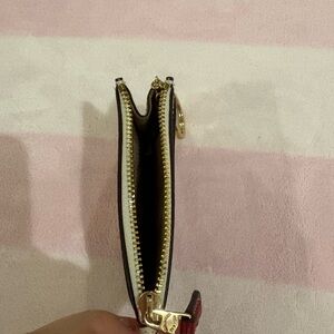 Off white /cream card holder wallet keychain with winter teddy bear design and gold hardware