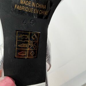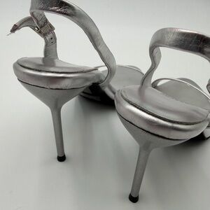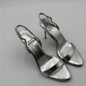 Only worn one time and from a smoke free home. Jeffrey Campbell Go-Getter stiletto sling-back in metallic silver leather Sz 6.5 that have no damages or stains.