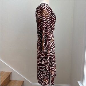 Keywords: bahama midi dress zen zebra animal print wrap dress a line belted brown white tan cream long sleeve womens small neutral print spring dress fall dress valentines outfit easter dress boho safari trend quiet luxury 90s revival mob wife aesthetic lightweight pullover pockets