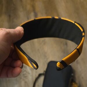 This Hogwarts crossbody bag is perfect for young fans. Featuring a striking black and gold design, it's both stylish and functional. Hufflepuff bag and headband are like new. No flaws, my daughter used each a few times. Bag measures 10 inch by 9 inch.