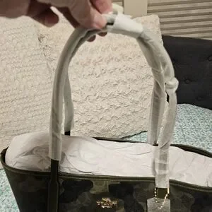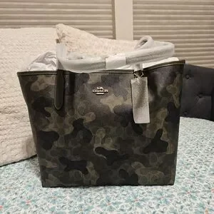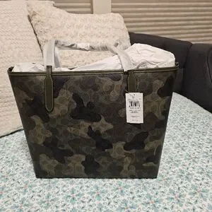 Chic Coach tote with a bold camouflage pattern. Ideal for everyday style. 14X12X6