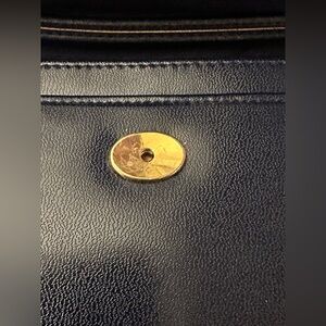 This elegant navy handbag is perfect for any occasion. Its sleek design and material make it a must-have accessory. Made in Western Germany between 1949 - 1990. Clean inside and out. Stitched well. Gold closure on one side needs to be reattached. Unsure of material but is an attractive bag.