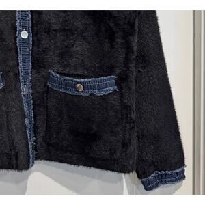 Beautiful MUESTRARIOS sweater jacket, recently purchased in Spain and new with tags. This unique boutique piece is made in Valencia, Spain, and features an ultra-soft black fuzzy knit fabric with denim embellishments, metal snap buttons, and two functional front pockets. Cozy, elevated, and statement-making with a modern European feel.