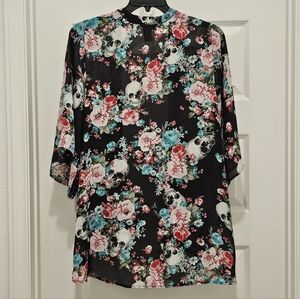 Hot Topic Floral Skull Print Hi-Lo Kimono Cardigan, EUC, Size X-Large