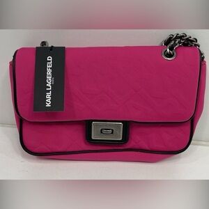 Vibrant pink shoulder bag. Chain strap detail. Elegant clasp closure.