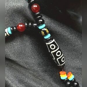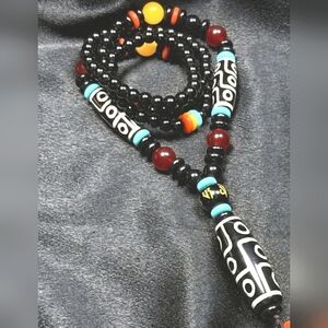 Unisex ethnic agate bead necklace; Tribal design with tassel charm, durable beads. Valued for its toughness and beauty.
