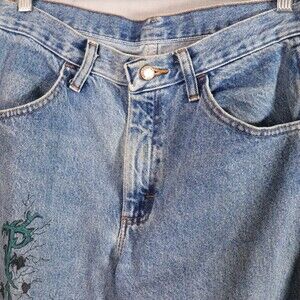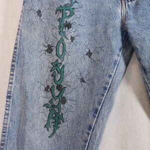 ✦ Condition:Good vintage condition with intentional hand-drawn artwork. Normal signs of vintage wear consistent with age. There is drag wear on the rear hem of both legs. No other structural issues noted. Please review photos carefully, as artwork placement and wear are part of the design.