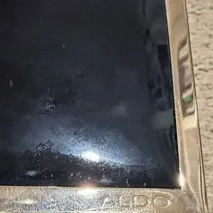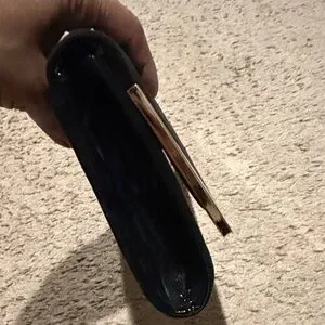 Chic black clutch with shiny gold trim. Perfect for evening outings. Stylish and versatile.