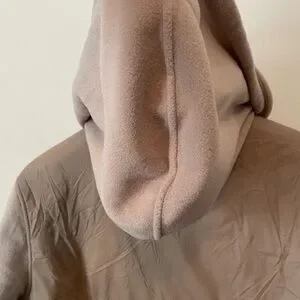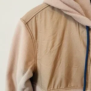 Neutral colored hooded fleece by Patagonia. Zipper closure in excellent condition. Label at chest size small.