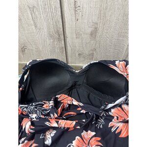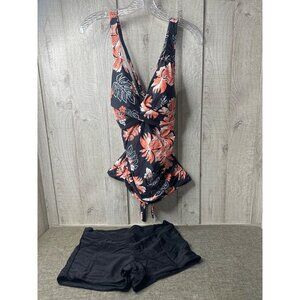 Womens Large Floral Tankini Swimsuit 2 pc Set With Boyshorts Black & Coral